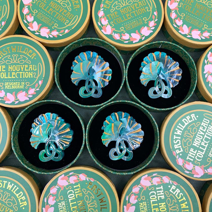 A floral fancy with flowing figures, a stylish symbol of Art Nouveau. Textured and glitter resins brought together with hand-assembled details make this an elegant adornment for fans of the style or just of chic shapes and classic colours.