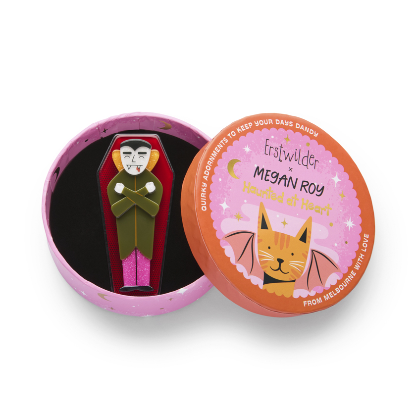 Eternal rest never looked so inviting. This sleepy vampire has swapped the drama for a doze, snuggled in a lined coffin with nothing but time and a toasty nap ahead. A limited-run brooch from the Haunted at Heart collection that’s all about comfort with a cryptic twist.