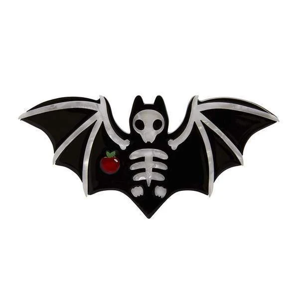 One of the many frightful familiars that comprise our affectionality titled ‘Bone Brigade’, this Bat out of Hell brooch has been hand-assembled from textured resins and brought to spooky life through a combination of hand-painted, printed and laser-etched details. Preferring fresh fruit to blood at all times, this flying marsupial wouldn’t bat an eyelid at the thought of an apple a day.